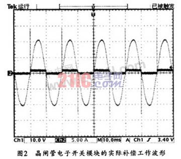 晶閘管電子開關模塊用在TSC低壓無功補償以替代接觸器,這樣,就可以在開關電壓過零時投入補償電容量,從而避免了沖擊電流的產(chǎn)生和瞬間電網(wǎng)電壓的波動。圖2所示是其工作波形圖。